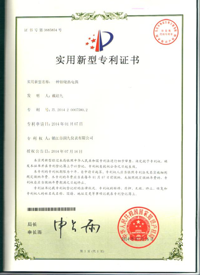 热烈祝贺镇江市润久仪表有限公司产品获实用新型专利。