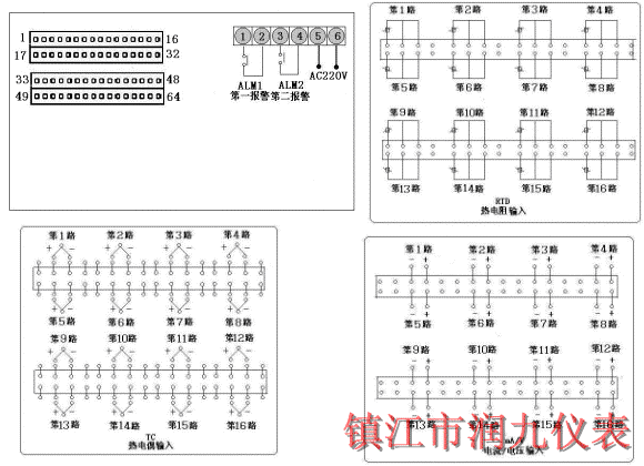 十六路巡检统一控制/报警输出,通讯方式RS485,继电器输出,输入类型CU50,第一报警为下限报警,第二报警为上限报警,不带报警记忆功能,AC90~265V供电。 |